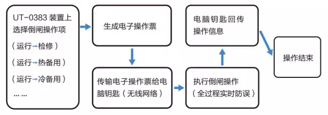 在每台开关柜安装一套UT-0383开关柜智能防误操显装置,用于采集断路器、刀闸(小车)、接地刀等位置信息及带电信息;在开关柜的就地/远方操作回路、小车摇孔、接地刀闸操作机构、前后柜门加装防误锁具。操作流程如下: