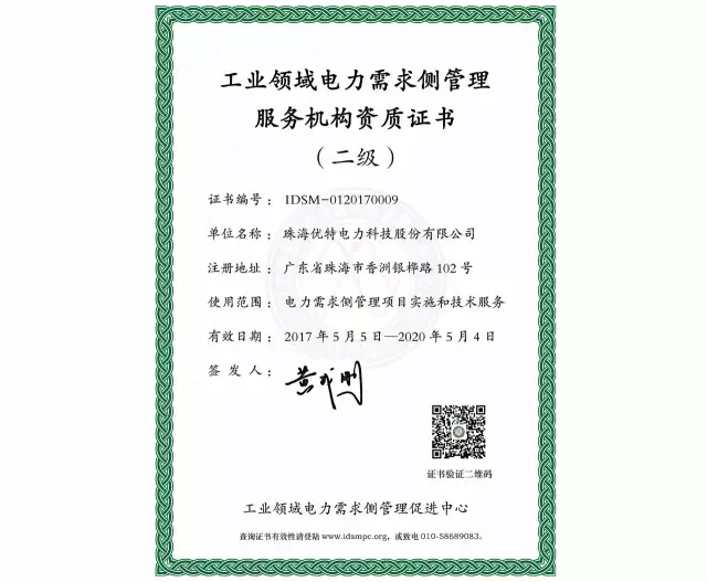 就在不久前,优特科技顺利通过了工业和信息化部工业领域电力需求侧管理促进中心(IDSM)综合考核评定,获颁“工业领域电力需求侧管理服务机构”资质证书。