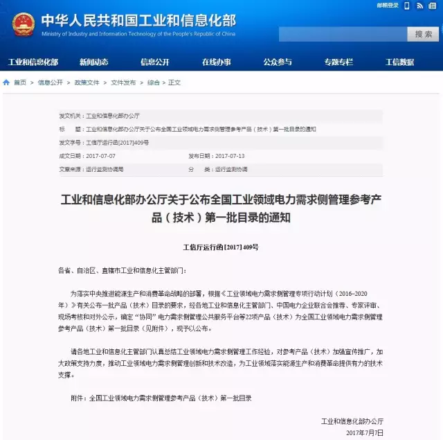 2016年,工信部为落实中央推进能源生产和消费革命的要求以及工业领域电力需求侧管理专项行动(2016-2020)的部署,在全国范围内开展的工业领域电力需求侧管理产品(技术)征集工作,经各地工业和信息化主管部门、中国电力企业联合会推荐、专家评审、现场考核和对外公示,仅有22项企业产品(技术)正式入选。
