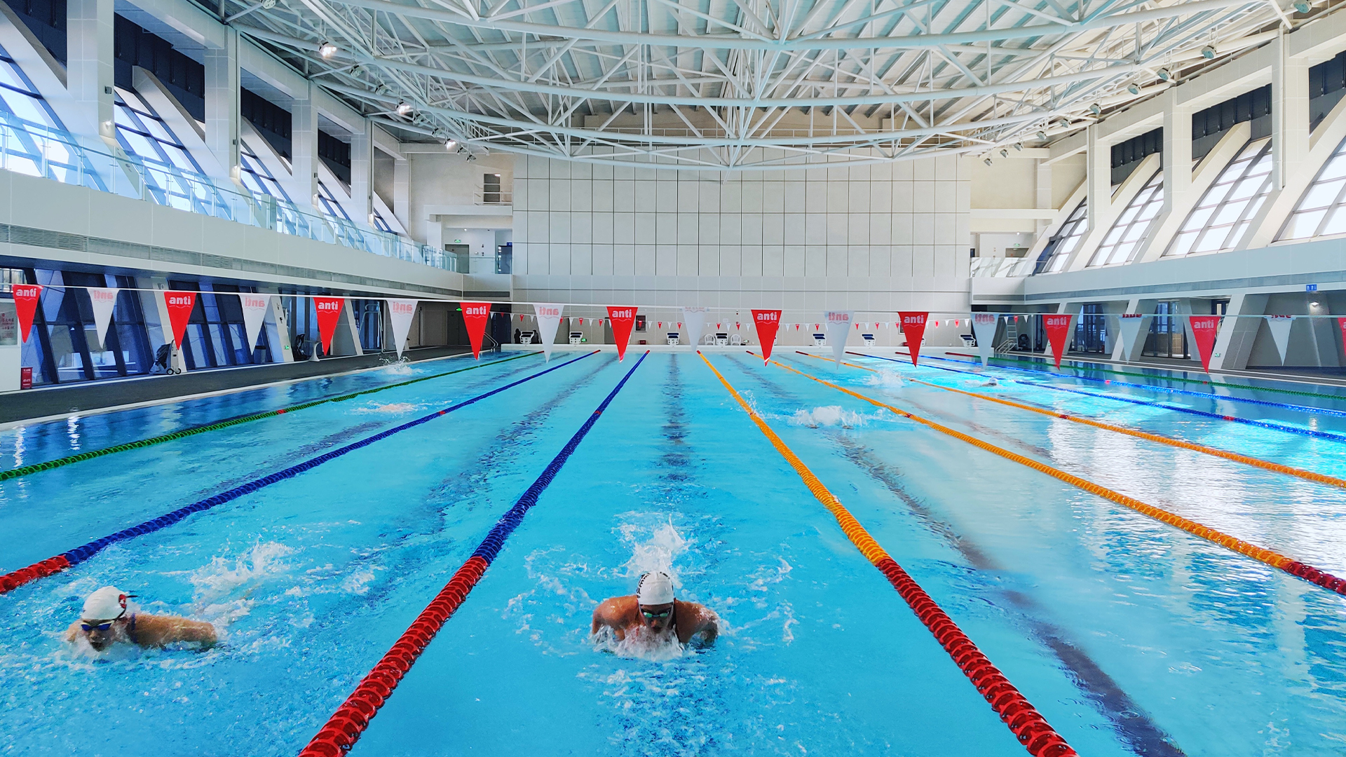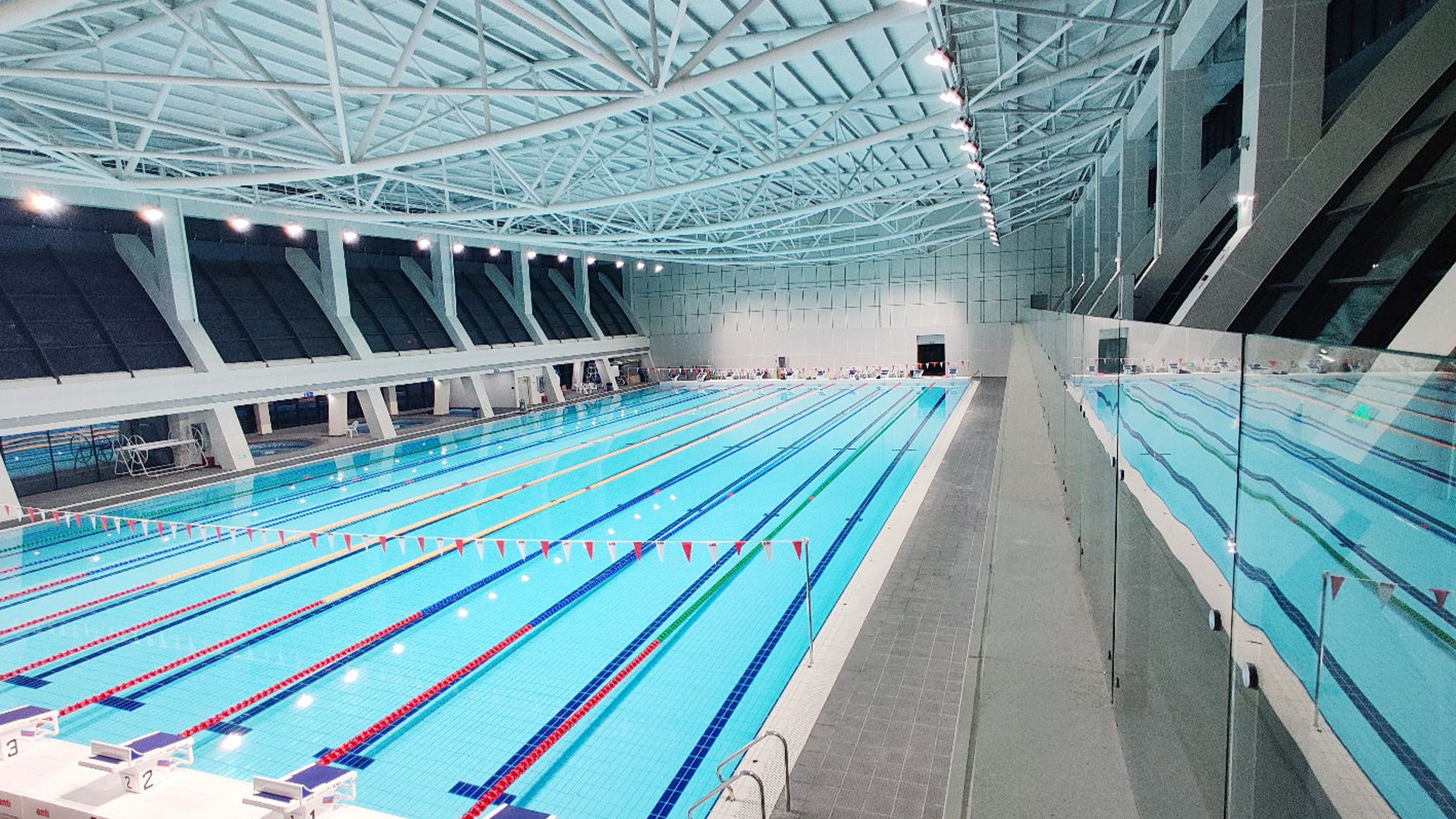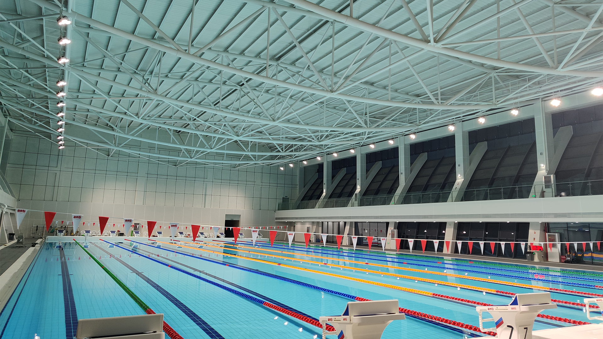 游泳池照明首先要为游泳者提供安全保障,救生员必须能清晰地看到发生危险的游泳者。另外,游泳比赛中,当运动员触池时,裁判员和观众要能清楚地看到触池动作。且作为常年处于高湿环境的室内体育馆,游泳馆照明灯具要求高度防水、防腐、防雾气,经久耐用。基于以上要求,七大洲为游泳馆量身设计了稳定的照明方案,采用防雨防雷级别灯具,胜任高湿环境,安全、舒适灯光环境为运动员保驾护航。