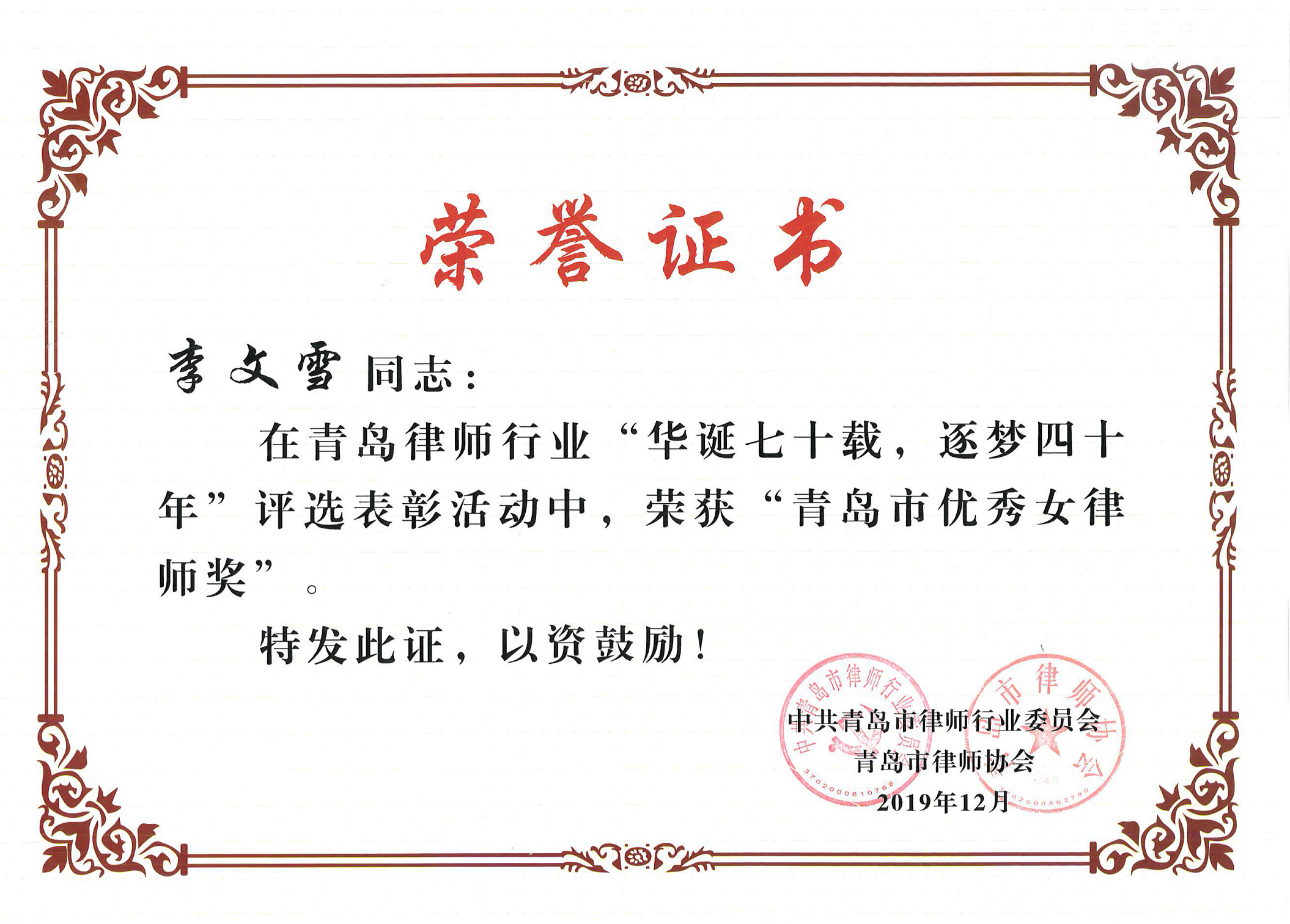 为庆祝新中国成立70周年,律师制度恢复重建40周年,展示青岛市律师队伍为法治建设和经济社会发展作出的突出贡献,弘扬行业正能量,扩大社会影响力,根据山东省律师协会统一部署,青岛市律师行业党委和青岛市律协在全市律师行业开展“华诞七十载,逐梦四十年”评选表彰活动。其中,国浩青岛合伙人李文雪荣获“青岛市优秀女律师奖”;国浩青岛合伙人肖颖荣获“青岛市律师行业社会公益奖”。