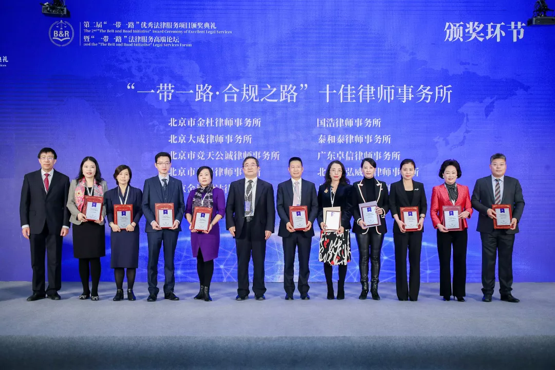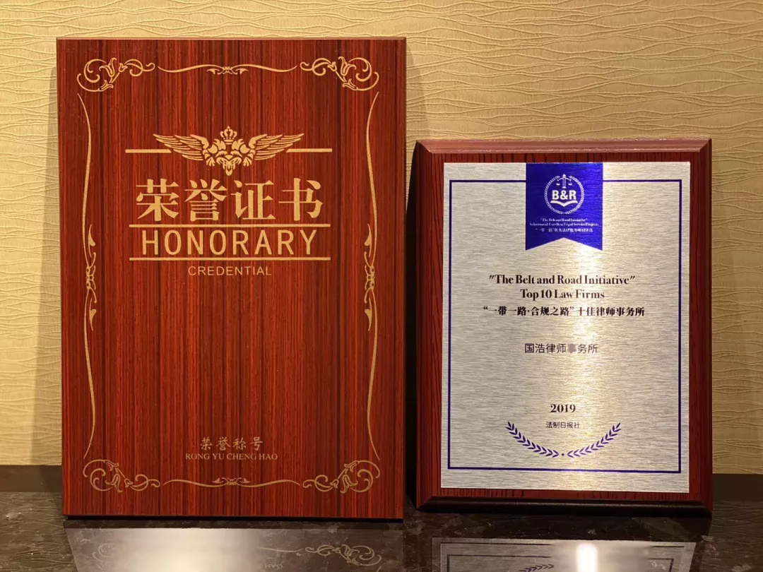 2019年12月22日,由法制日报社主办、法制网承办的第二届“一带一路”优秀法律服务项目颁奖典礼暨“一带一路”法律服务高端论坛在北京隆重举行。国浩律师事务所凭借在“一带一路”相关领域的卓越表现荣获两大殊荣: