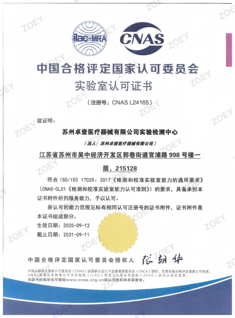 近日,江苏关怀医疗科技(集团)有限公司(简称“集团”)旗下全资子公司--苏州卓壹医疗器械有限公司实验检测中心(以下简称“检测中心”)已正式通过中国合格评定国家认可委员会(英文缩写:CNAS)的严格评审,成功获得实验室认可证书(注册号:L24165)。